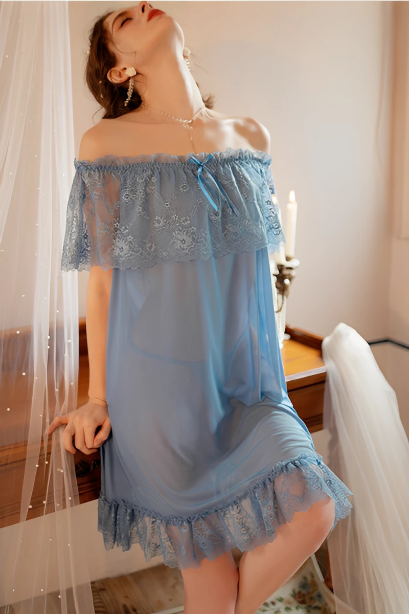 Sexy bulk lace sexy pajamas with off-shoulder lace trim and sheer fabric, ideal for plus size ranges, clubwear styling, and B2B lingerie supply.