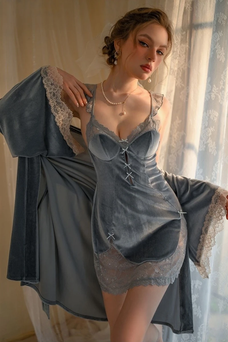 Bulk Nightgowns Sexy Lace Satin Slip Dress with Matching Robe for Nightwear 2348