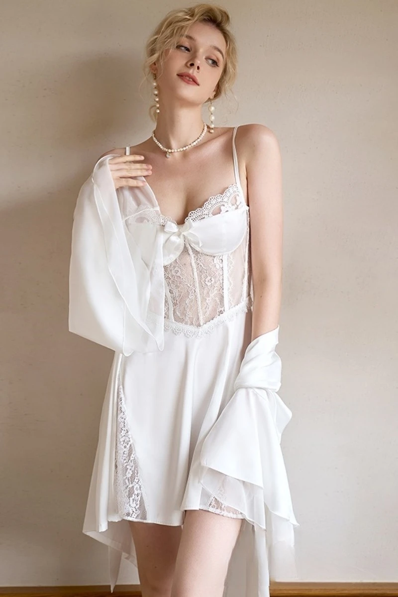 Sheer lace sections define the waist and neckline, creating visual contrast with the soft, semi-transparent fabric. The cut supports comfortable wear for nightwear and coordinated lingerie sets. Fabric selection balances transparency, softness, and durability to maintain shape through repeated washing.