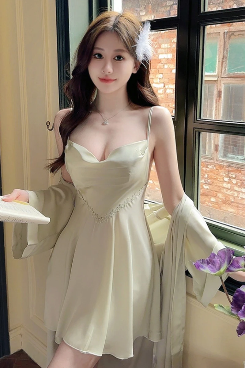 This custom womens sexy nightgown is designed as a refined satin slip dress for lingerie and nightwear collections. The style features a softly draped bust, slim adjustable straps, and a smooth, lightweight satin body that offers a flattering fit across sizes. The length falls above the knee, creating a balanced silhouette suitable for modern nightwear and bridal-inspired sets.