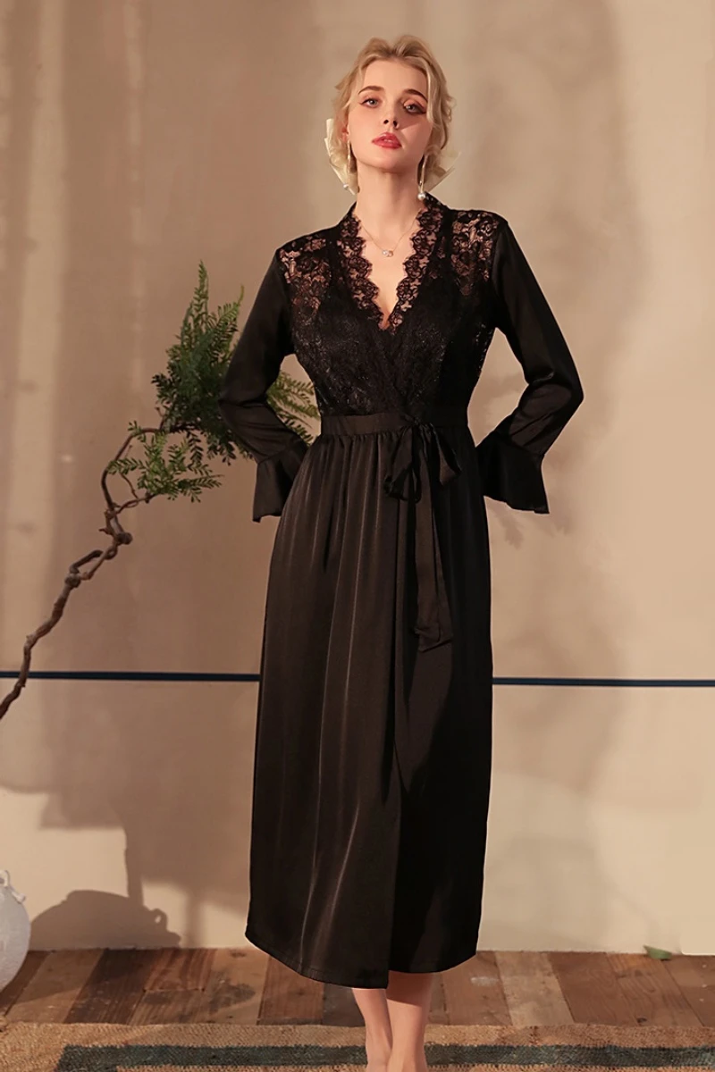 Women Sexy Nightgowns Lace V-Neck Long Sleeve Maxi Night Dress 522
